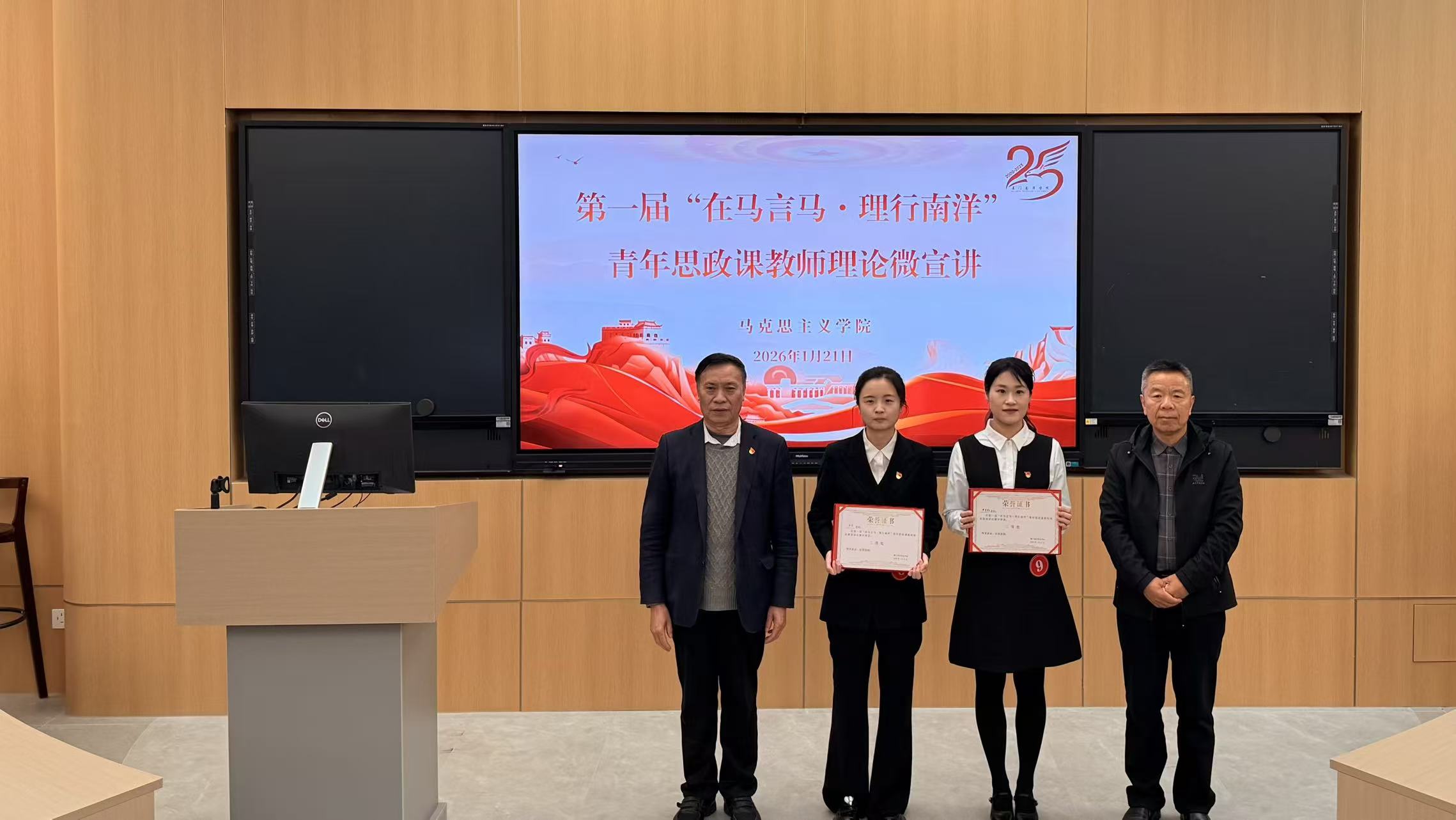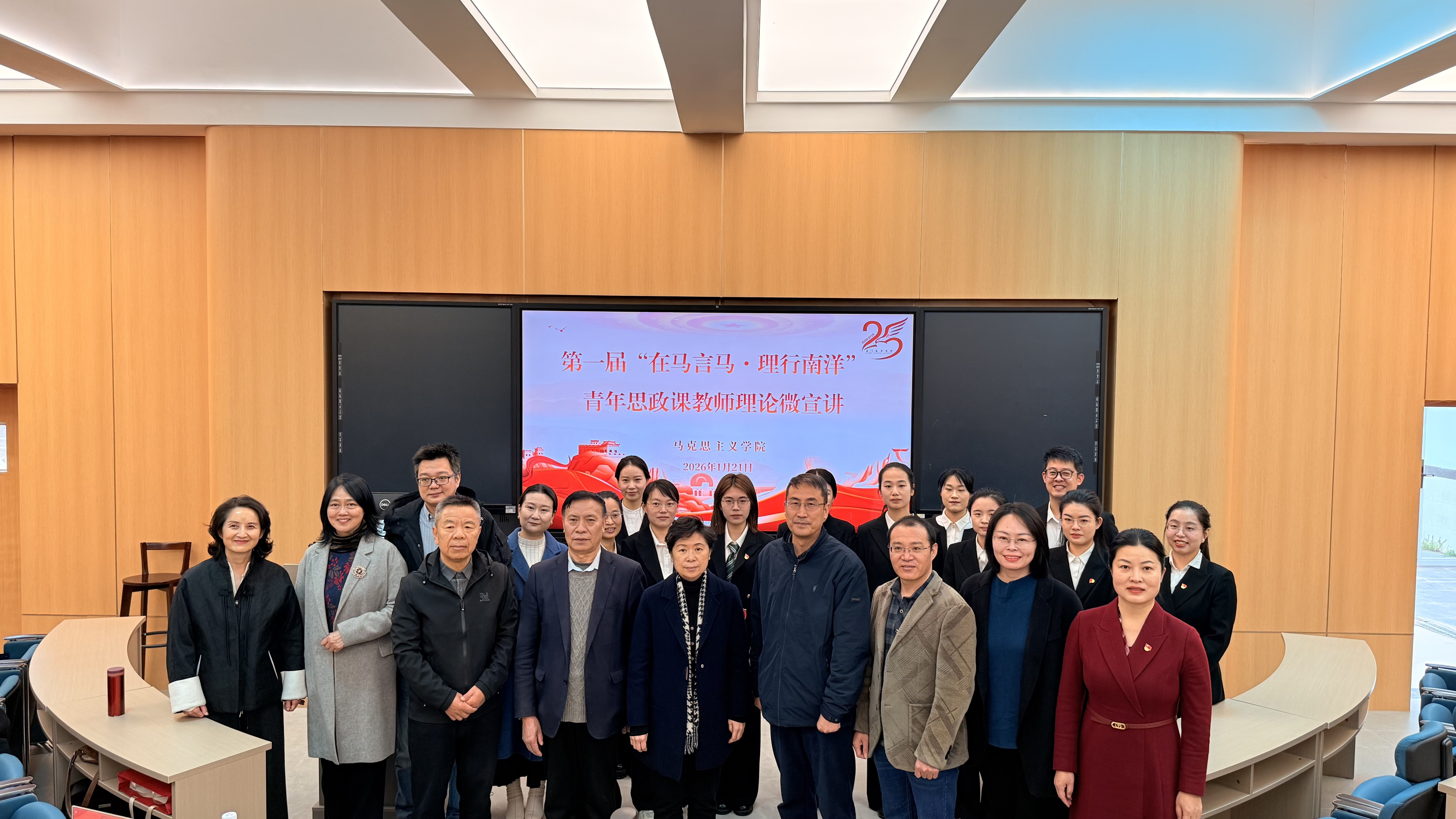为深入贯彻落实立德树人根本任务,扎实推进新时代思想政治理论课改革创新,锻造一支“政治强、情怀深、思维新、视野广、自律严、人格正”的青年思政课教师队伍,2026年1月21日,我校举办第一届青年思政课教师理论微宣讲比赛。校党委书记陈宏瑶、校长助理侯红科及马克思主义学院全体教师参加活动。